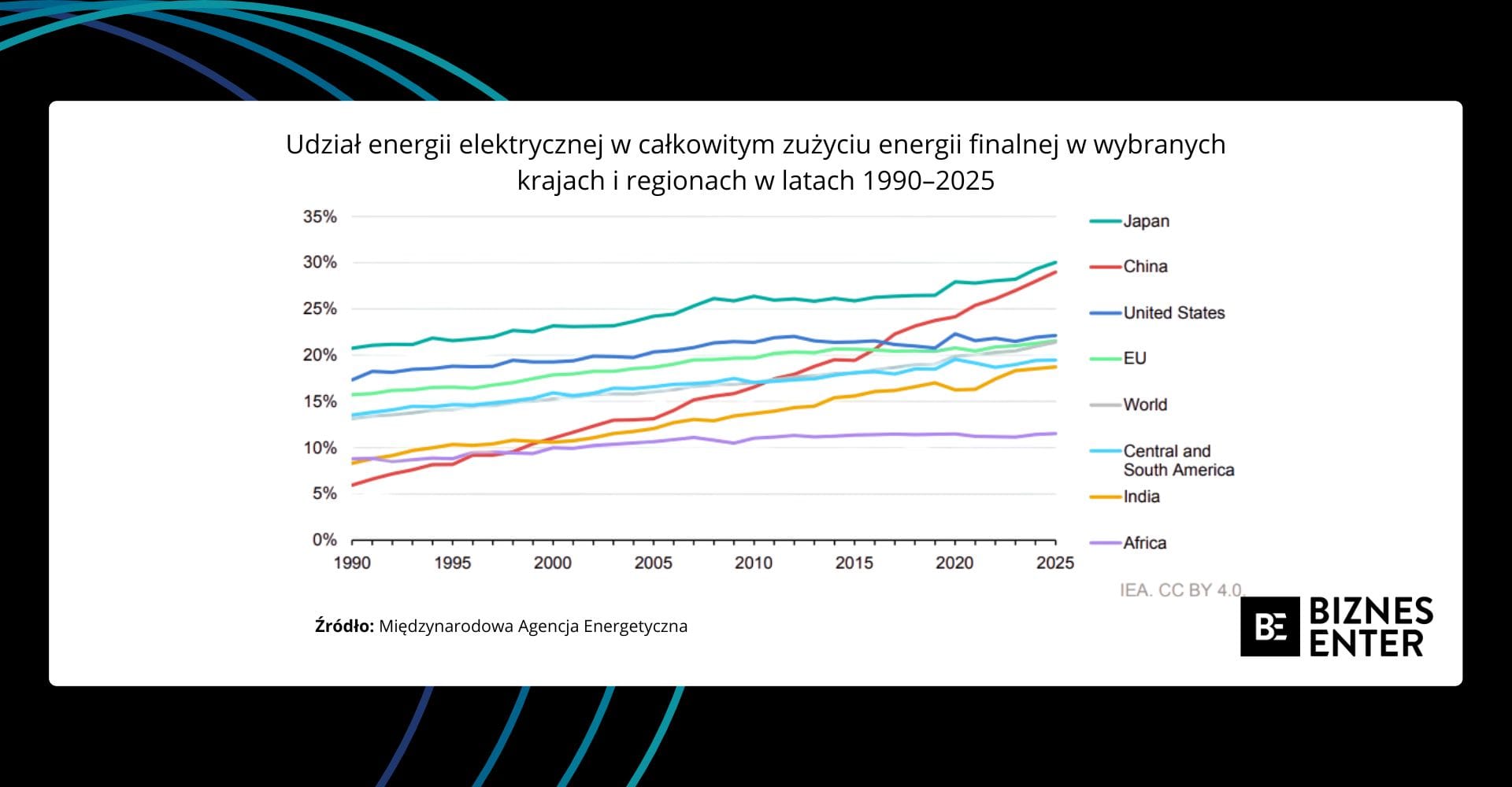 - Dowód. Jak pokazuje w swoim najnowszym raporcie MAE, w ciągu zaledwie 35 lat jej udział w całkowitym zużyciu energii finalnej poszczególnych państw świata wzrósł od 10 do nawet 20 pp.