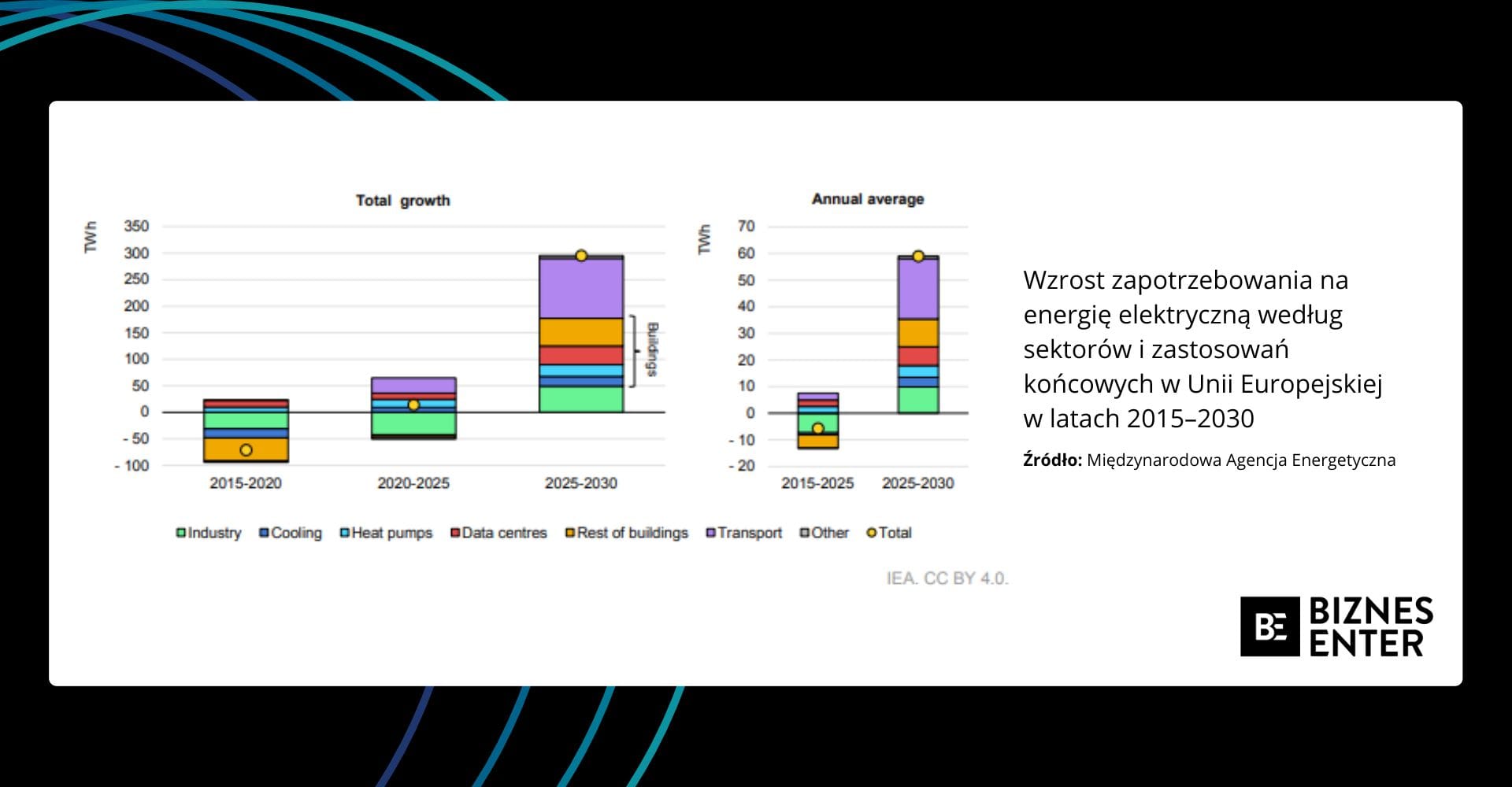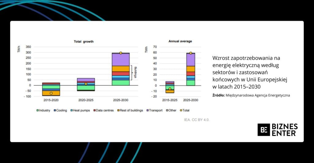 Po trudnym okresie między 2022 a 2023 r. europejski popyt na energię elektryczną zaczął się odbudowywać. Według szacunków MAE w 2024 r. wzrósł on o 1,6 proc., a w 2025 r. o kolejne 0,9 proc. Łącznie, według prognoz Agencji, zapotrzebowanie na energię elektryczną w UE wzrośnie o około 300 TWh. Dla porównania, dziś tyle zużywają np. Włochy.