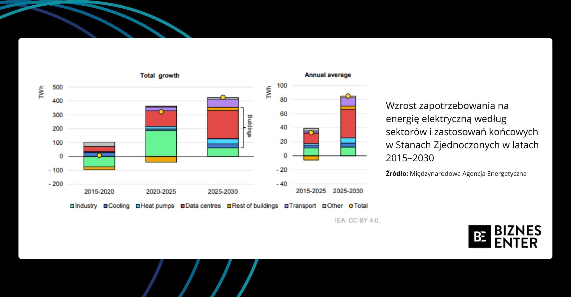 Nowe legislacje przełożyły się na wzmożony ruch na placach budowy. Jak podaje MAE, w latach 2024-2025 budownictwo mieszkaniowe i komercyjne odpowiadało łącznie za ponad 70 proc. wzrostu popytu na energię elektryczną w USA. Każdy nowy obiekt oznacza bowiem nie tylko większą powierzchnię użytkową, lecz także coraz wyższe zużycie prądu związane z ogrzewaniem, klimatyzacją, czy odbywającą się na jego obszarze produkcją.