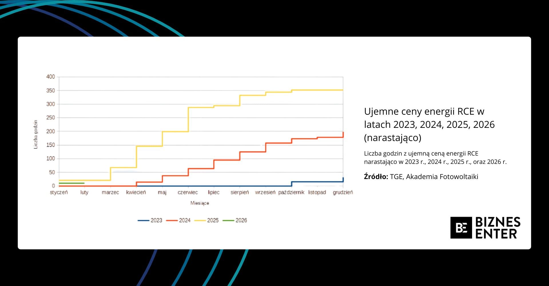 Rozwój zjawiska występowania ujemnych cen energii prześledzili eksperci Akademii Fotowoltaiki. W swojej analizie zauważyli, że od początku 2023 r. do stycznia 2026 r. odnotowano łącznie 593 godziny z ujemną ceną energii w ramach ustalanych Rynkowych Cen Energii (RCE). Były to godzinowe stawki za prąd ustalane na Towarowej Giełdzie Energii w oparciu o bieżący popyt i podaż. Jednak od października 2025 r. zmieniono okno rozliczeniowe z godziny do kwadransa.