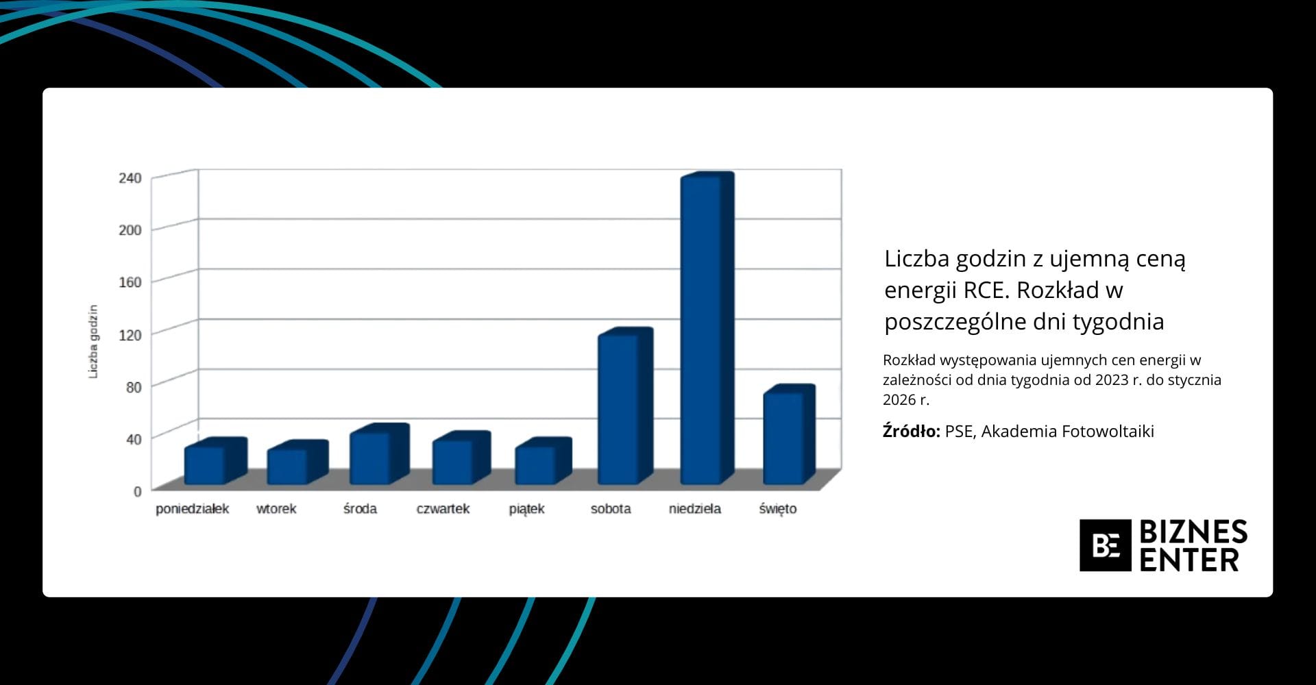 Eksperci Akademii Fotowoltaiki znaleźli jednak inną prawidłowość. Ujemne ceny energii najczęściej występują w soboty, niedziele oraz inne dni wolne od pracy. Jest to zatem konsekwencja pięciodniowego tygodnia pracy. Kiedy pracownicy cieszą się chwilą wytchnienia, to instalacje wciąż pracują, dostarczając energię do systemu. Prąd więc jest, ale odbiorców, z racji na dzień wolny, brakuje, co prowadzi do powstawania cen ujemnych.