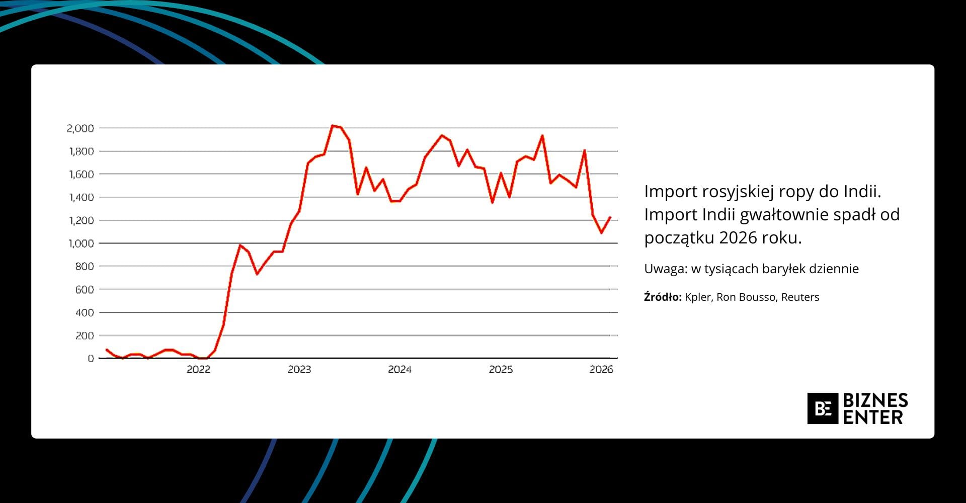 - Teza. Jeszcze w 2025 r. Indie sprowadzały z Rosji około 1,7 mln baryłek ropy dziennie. Taki wynik stanowił niemal połowę całego morskiego eksportu Moskwy. Nowe uwarunkowania geopolityczne jednak odcinają rosyjskie firmy od tego rynku.