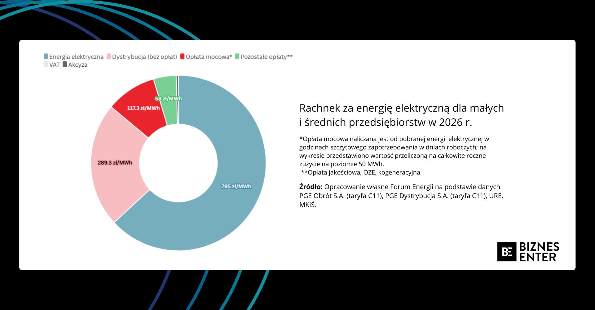 Jak podaje Forum Energii, dla tej grupy odbiorców (czyli firm o mocy zamówionej powyżej 16 kW) w 2026 r. stawka ustalona przez URE wynosi 219,4 zł za MWh. Taka wartość przełożyłaby się na około 9,3 proc. rachunku za energię elektryczną.