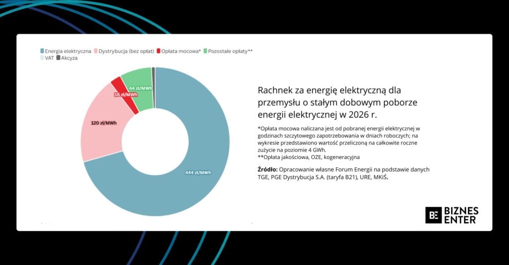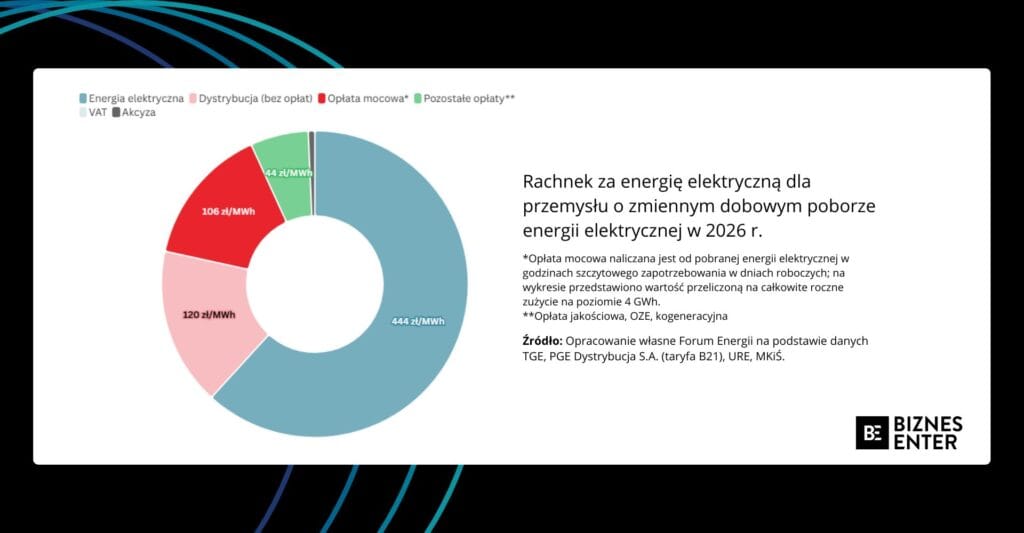 - Teza. Wzrost stawek opłaty mocowej w 2026 r. znacząco podniesie udział kosztów systemowych w rachunkach za energię elektryczną. Udział ten wyniesie od 8,1 proc. dla gospodarstw domowych do 14,7 proc. dla części MŚP i przemysłu.