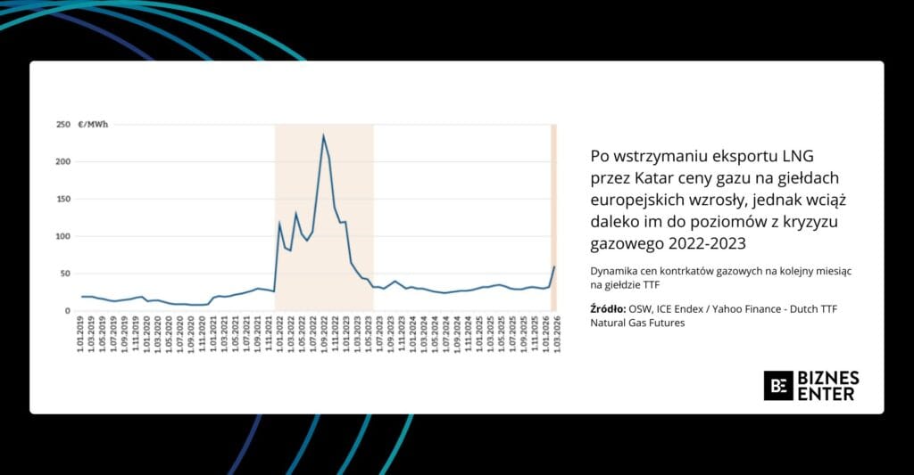 Wtedy to w marcu 2022 r., na platformie transakcyjnej ICE, kontrakty terminowe na dostawy tego surowca były wyceniane nawet do 250 euro za MWh. Jak widać na zaprezentowanym przez Ośrodek Studiów Wschodnich wykresie, aktualne wzrosty na rynkach nie są porównywalne do tego, co miało miejsce 4 lata temu.