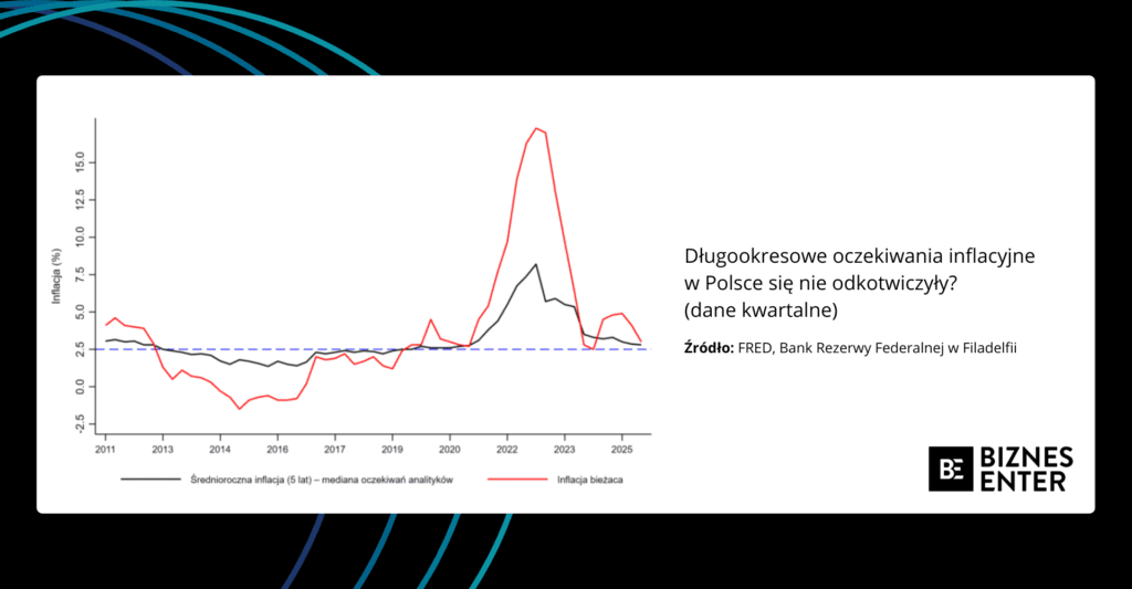 Z wykresu wynika, że oczekiwania inflacyjne początkowo wzrosły, ale nie tak mocno, jak inflacja. W szczytowym momencie, gdy inflacja CPI dobiła 17,3 proc. rok do roku, mediana oczekiwań analityków wynosiła 8,2 proc. Co więcej, niedługo później zaczęły one szybko spadać. Obecnie medianowo eksperci zakładają, że w horyzoncie najbliższych pięciu lat średnioroczna inflacja będzie jedynie nieznacznie wyższa od 2,5 proc., czyli od celu inflacyjnego NBP.