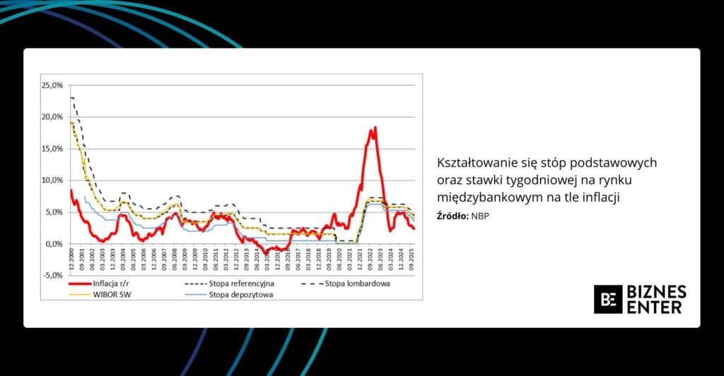 Poręcznym może być tu rzut oka na wykres obrazujący, jak na tle inflacji kształtowały się stopy podstawowe oraz stawka tygodniowa na rynku międzybankowym (to ta, którą reguluje obecnie stopa referencyjna).