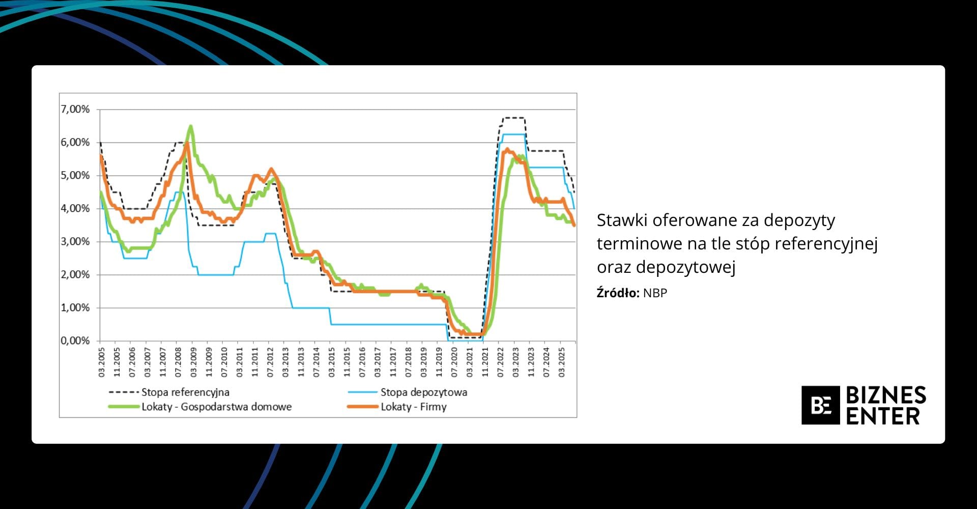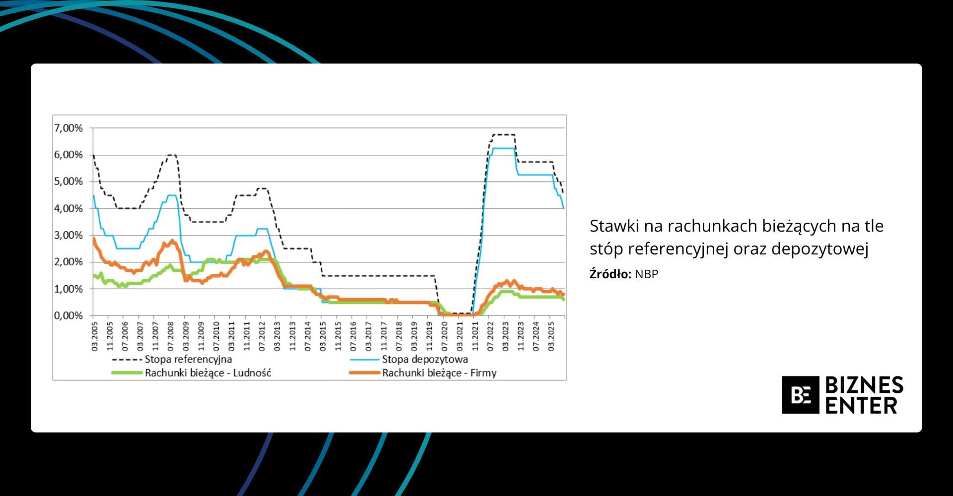 Na drugi ogień weźmy stawki na rachunkach bieżących. To są środki mniej pewne w porównaniu z lokatami. Z drugiej strony, gdyby bank miał ich któregoś dnia za dużo – to może ich nadmiar (w stosunku do potrzeb czy możliwości rozsądnego ulokowania) oddać do NBP po stopie depozytowej. W konsekwencji stawki za środki na rachunkach bieżących były zbliżone do poziomu stopy depozytowej. Czasem bardzo zgodne, czasem nieco niższe, ale wciąż „w fali”.