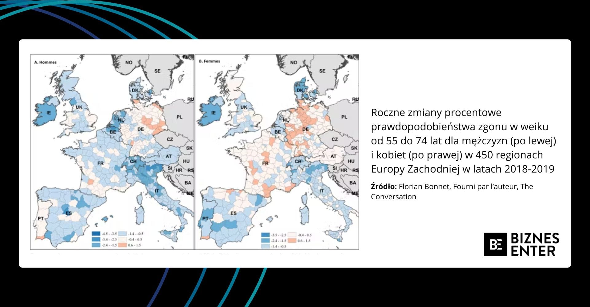 Za średnią długością życia w danym kraju kryją się bardzo zróżnicowane, regionalne realia. Aby pokazać pełne spektrum problemu, badacze postanowili przeliczyć roczny wzrost oczekiwanej długości życia w każdym regionie, jednego z 13 państw zachodniej Europy. Swoje wyliczenia oparli o danych z lat 1992-2019.