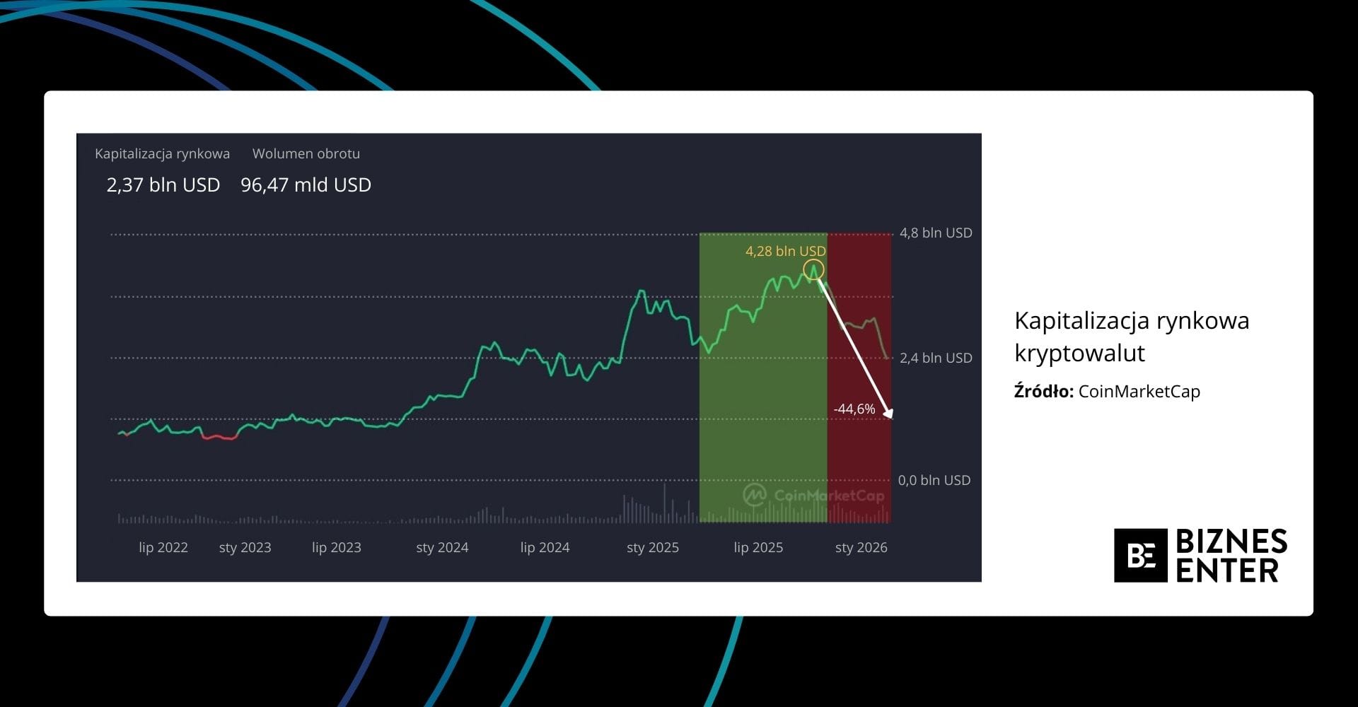 Wykres CoinMarketCap, strony agregującej na bieżąco wyceny kryptowalut, jasno ukazuje rozmiary tąpnięcia tego sektora. W poniedziałek jego wartość wynosiła 2,37 bln dolarów. To mniej o ok. 44,6 proc. w porównaniu do historycznego maksimum zanotowanego w październiku 2025 r. (4,20 bln dolarów).