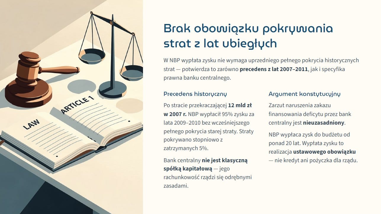 Według ich narracji, skoro kilkanaście lat temu bank zdołał przekazać zysk do budżetu mimo wcześniejszej, drastycznej straty przekraczającej 12 miliardów złotych, to dzisiejsza operacja na złocie jest jedynie niewinnym powieleniem sprawdzonych procedur.