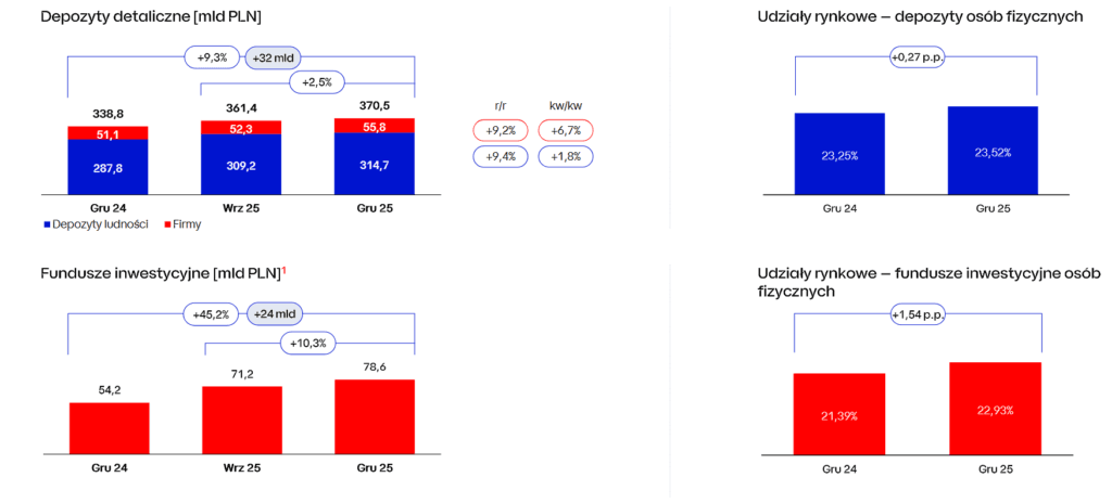 Rewolucję w podejściu do inwestycji widać w liczbach bezwzględnych. Bank zanotował gigantyczny, przekraczający 45 proc. w ujęciu rocznym, przyrost aktywów detalicznych zgromadzonych w wyspecjalizowanych funduszach inwestycyjnych. Zaczęliśmy ufać ekspertom i ulokowaliśmy w TFI łącznie 78,6 mld zł, co stanowi przełomowy moment w świadomym budowaniu prywatnego bogactwa Polaków.