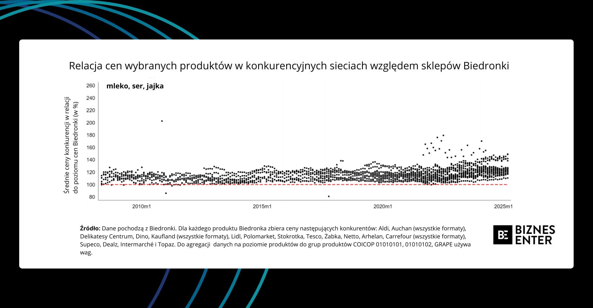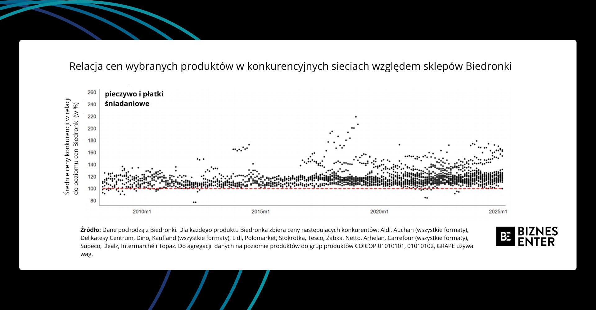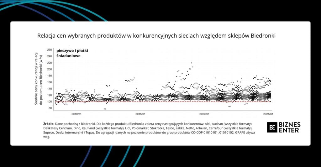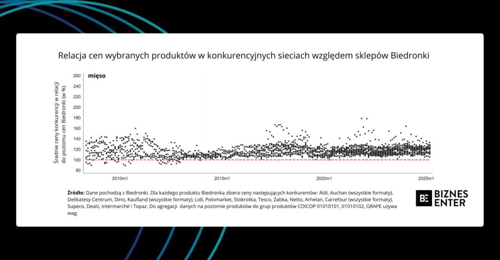 I tak w latach 2008-2013 Biedronka nie wyróżniała się znacząco na tle konkurencji pod względem poziomu cen – plasowała się raczej w środku rynkowej stawki. Zmiana strategii nastąpiła wyraźnie w okolicach 2014 r. Od tego momentu analiza tysięcy punktów danych pokazuje, że Biedronka systematycznie utrzymuje najniższe ceny w większości podstawowych kategorii produktowych, takich jak nabiał, artykuły sypkie, mięso czy chemia gospodarcza.