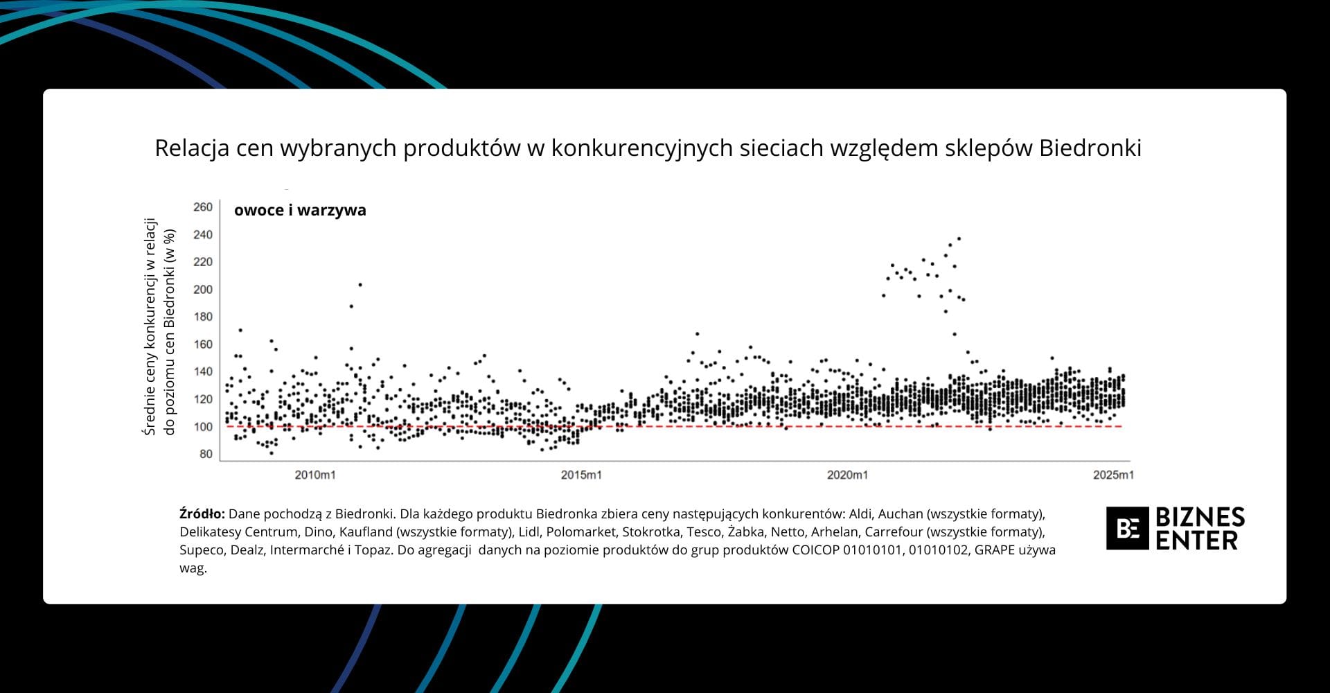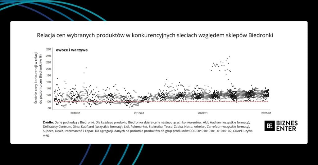 Z naszej analizy wynika, że począwszy od 2014 r. Biedronka systematycznie oferuje najniższe ceny w każdej grupie produktów, z wyjątkiem owoców i warzyw. W latach 2008-2013 w przypadku niektórych grup produktowych ceny w Biedronce mieściły się wewnątrz rozkładu cen konkurencji. W żadnym okresie jednak Biedronka nie oferowała wysokich, a tym bardziej najwyższych cen. Po 2014 r. Biedronka stała się jedynym sprzedawcą detalicznym z najniższymi cenami w kategoriach uwzględnionych w danych liczbowych.