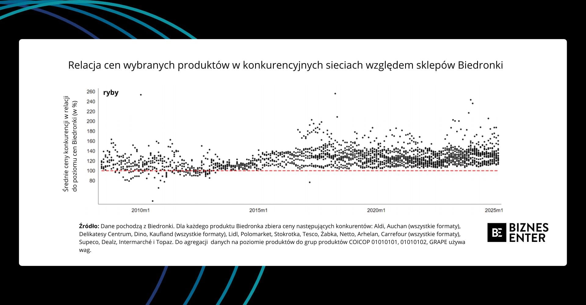 Aby rozstrzygnąć spór o to, kto dyktuje najtwardsze warunki cenowe, eksperci z Ośrodka Badawczego GRAPE sięgnęli po potężne zbiory danych transakcyjnych i cenników monitorowanych przez samego rynkowego lidera obejmujące okres od 2008 r. Sieć ta bowiem systematycznie bada ceny u swoich głównych konkurentów – od Lidla i Aldi, przez hipermarkety takie jak Auchan i Kaufland, aż po mniejsze formaty pokroju Dino, Żabki czy lokalnych supermarketów.