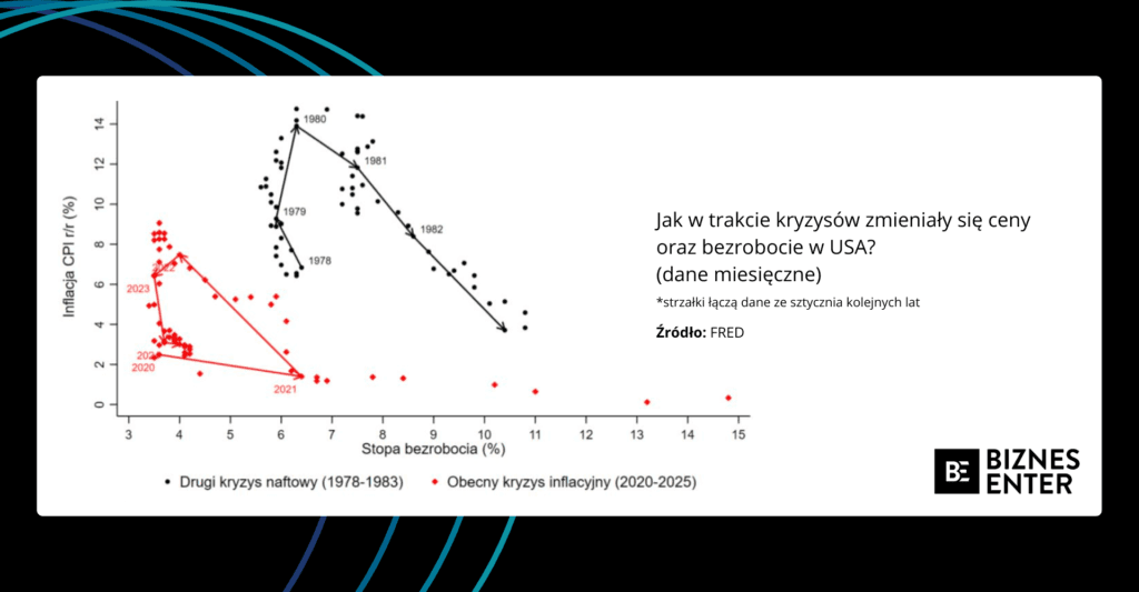 W Stanach Zjednoczonych inflacja cen dóbr konsumpcyjnych spadła z ponad 9 proc. rdr. w czerwcu 2022 r. do niecałych 3 proc. rdr. dokładnie dwa lata później, przy wzroście stopy bezrobocia zaledwie o pół punktu procentowego z 3,6 proc. do 4,1 proc. Dla porównania w trakcie drugiego kryzysu naftowego od marca 1980 r. do marca 1982 r. inflację CPI zbito z 14,8 proc. rdr. do około 6,8 proc. rdr. Jednakże w tym czasie miał miejsce wzrost stopy bezrobocia o 2,7 punktu procentowego z 6,3 proc. do 9 proc.