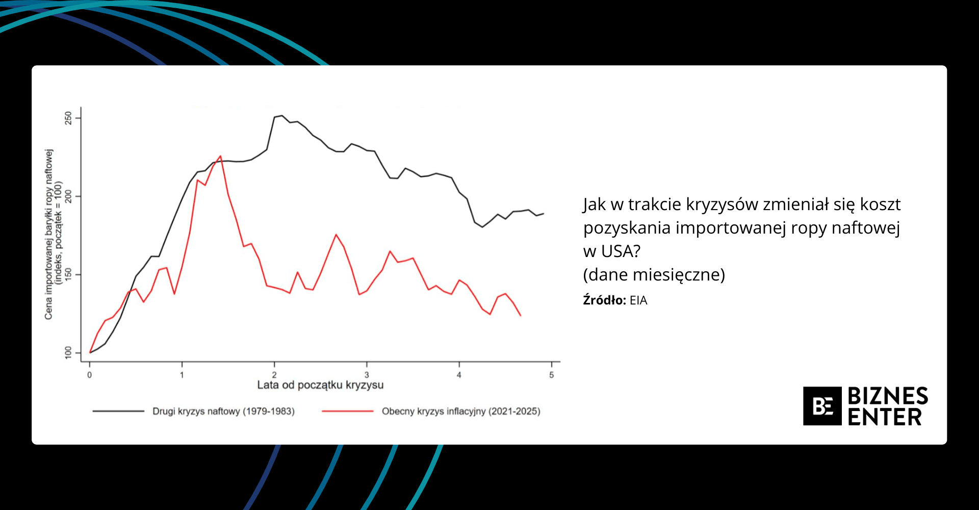 Mimo że oba kryzysy wywołały szoki energetyczne, obecny różni się od tego z lat 80. pod względem trwałości — tym razem wzrost cen energii miał wyraźnie tymczasowy charakter. W trakcie drugiego kryzysu naftowego cena importowanej baryłki ropy spadła poniżej 30 dolarów w lutym 1983 r., a poniżej 20 dolarów dopiero w styczniu 1986 r. Z kolei podczas obecnego kryzysu już w 2023 r. cena baryłki ropy naftowej roku przeciętnie wynosiła 74,5 dolara. Średnia cena importowanego gazu LNG spadła zaś do 11,8 dolarów, czyli była praktyczne taka sama jak w 2021 r. Tę różnicę w trwałości szoków bardzo dobrze na zamieszczonym poniżej wykresie. W tracie obecnego kryzysu ceny ropy naftowej wróciły do wcześniej notowanych poziomów znacznie szybciej niż w trakcie drugiego kryzysu naftowego.
