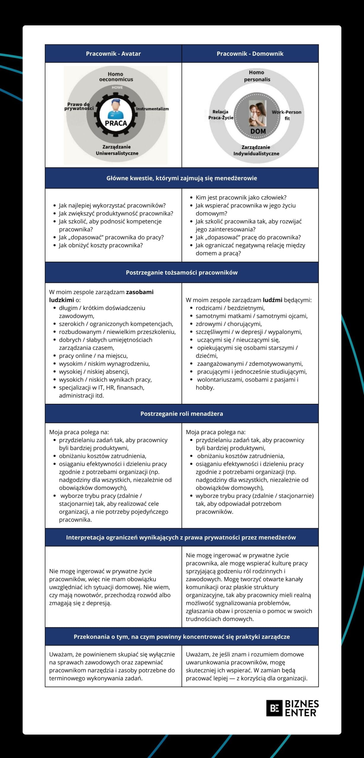 - Model Pracownik–Domownik pokazuje alternatywę zgodną z ochroną prywatności, ale bardziej adekwatną do współczesnych realiów pracy. W tym ujęciu pracownika postrzega się jako osobę, a nie wyłącznie funkcję. Zarządzanie odwołuje się do personalizmu i humanizacji pracy, szuka najlepszego dopasowania człowieka do pracy (work-person fit) oraz wspiera zdrową relację praca–życie. Kluczem nie jest zbieranie informacji o sprawach prywatnych pracownika (co jest niezgodnie z prawem), lecz na tworzeniu warunków, w których pracownik może bezpiecznie sygnalizować ograniczenia wpływające na pracę. Różnice w zarzadzaniu w dwóch modelach są opisane w tabeli.