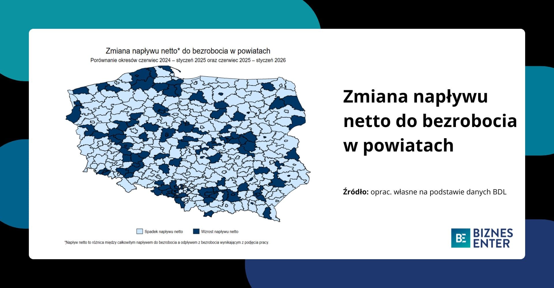 Co więcej, dane potwierdzają również hipotezę o wpływie zmian regulacyjnych na geografię bezrobocia w danych. Na zamieszczonym poniżej wykresie przedstawiono zmianę napływu netto do bezrobocia (różnicy między całkowitym napływem do bezrobocia a odpływem wynikającym z podjęcia pracy) pomiędzy okresami czerwiec 2024 r. – styczeń 2025 r. oraz czerwiec 2025 r. – styczeń 2026 r. Wzrost napływu netto oznacza, że w późniejszym okresie do rejestru osób bezrobotnych trafiło relatywnie więcej osób lub relatywnie mniej osób zostało z nich wyrejestrowanych z powodu podjęcia pracy, natomiast spadek oznacza sytuację odwrotną.