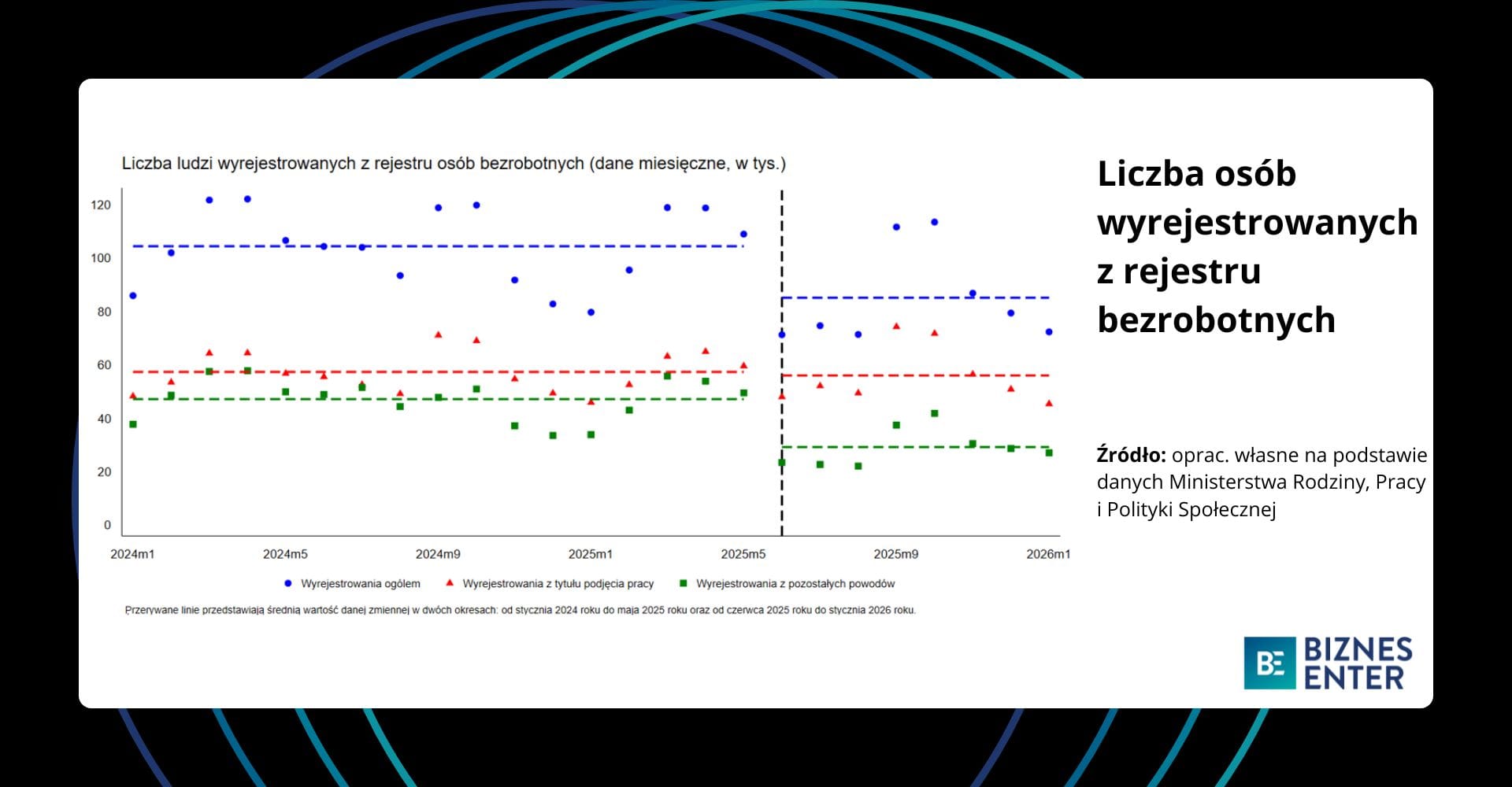 - Z kolei liczba osób wyrejestrowujących się z urzędów pracy z tytułu podjęcia pracy nie uległa żadnej widocznej zmianie po maju 2025 r.
